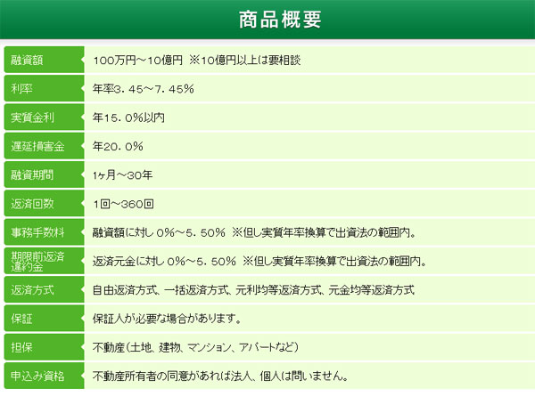 返済方法は、自由返済方式、一括返済方式、元利均等返済方式、元金均等返済方式、利率は年3.45〜7.45%、実質金利は15.0%以内となっています。